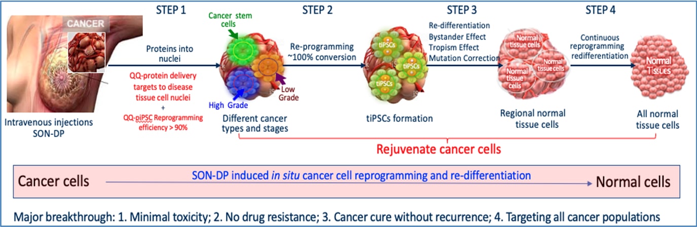 Unlike the current cancer therapies including chemotherapy, radiation therapy, targeted therapy and immunotherapy that focuses on killing cancer cells, our innovative SON-DP induced cell-converting cancer therapy centers at reprogramming cancer cells in vivo into transient pluripotent stem cells (tiPSCs) that regain differentiation potentials. Under the differentiating tissue micro-environment, the newly in situ generated tiPSCs quickly re-differentiate into younger healthy resident tissue cells. This new cancer therapy applies a innovative breakthrough strategy for cancer treatment.